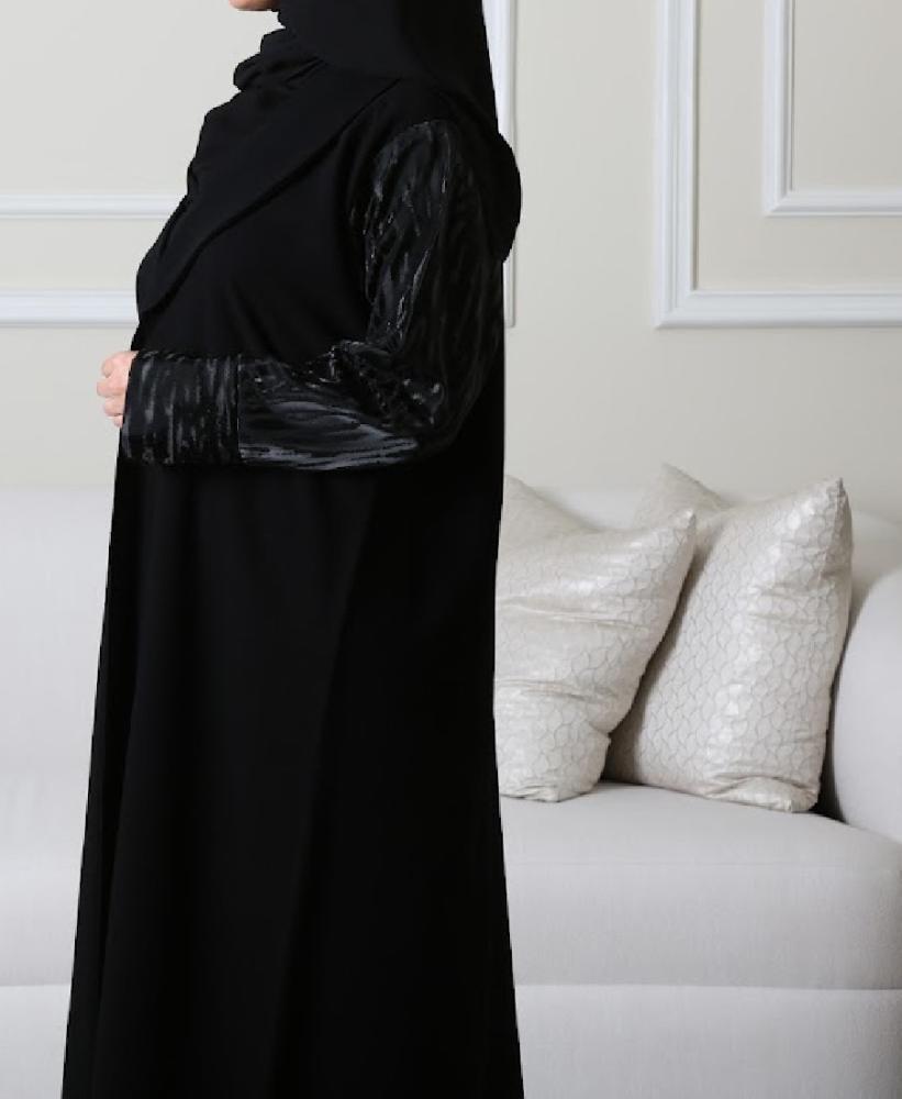 عباية كريب أسود وجلد بنمط التايقر بتصميم عصري وأنيق